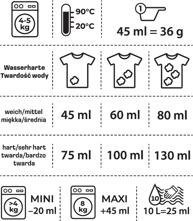 W zależności od twardości wody, stopnia zanieczyszczenia i wsadu pralki, odmierz odpowiednią ilość detergentu. Należy przestrzegać zalecanej ilości wsadu podanej przez producenta urządzenia. Nie nadaje się do wełny i jedwabiu. Postępuj zgodnie z instrukcjami pielęgnacji podanymi na tekstyliach. Sortuj pranie według koloru, stopnia zabrudzenia i temperatury prania.